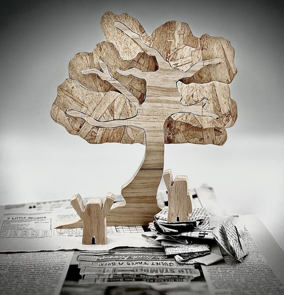 The primary purpose of this piece is to express the impact of educational inequality on people's futures. I used woodworking to make the form of the tree and the figures, as it's our natural right to reach our potential, which the tree represents. The person on the right stands on a stack of paper, representing educational opportunities, boosting their reach and making it easier for them to touch the tree. However, with the disparities in educational resource allocation, it's nigh impossible for the child on the ground to reach the tree no matter how hard they try, with scarce to no resources to extend their reach.