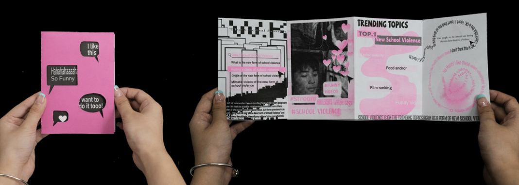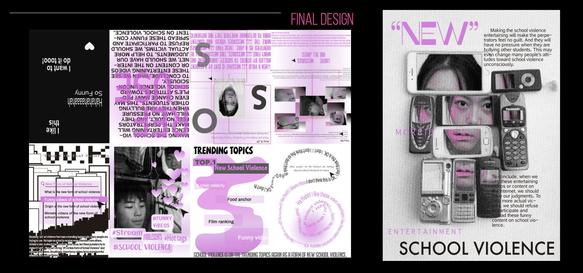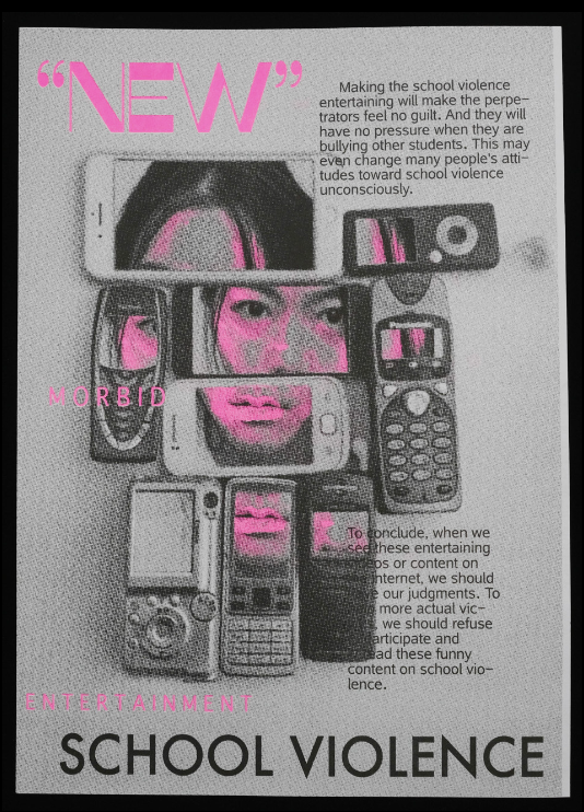 School violence has always been a social focus. In 2022, a short video with the tag new-school violence was on the top online search. Many people identified this video as entertaining, triggering internet bloggers to follow the trend of creating related videos. The actual school violence became a pastime topic, which brought secondary harm to the real victims and weakened the perpetrator's sense of guilt. Gradually, people's perspectives and attitudes toward school violence were unconsciously changed. To solve this issue, I designed this booklet to bring people a correct perception of the harm of making school violence entertaining and propagate to people about actual school violence. We should reject entertaining school violence videos to protect the real victims harmed by perpetrators.