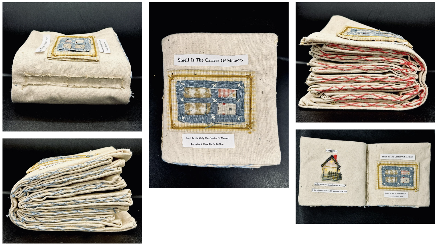 This project explores the sensory memory of space through a handmade zine crafted entirely from fabric. The work began with an assignment to observe and reflect on one’s immediate surroundings—my dorm room. While I initially planned to study light and spatial composition, I soon realized that what truly defined my room was its smell. Each scent carried a memory: of warmth, routine, or solitude.