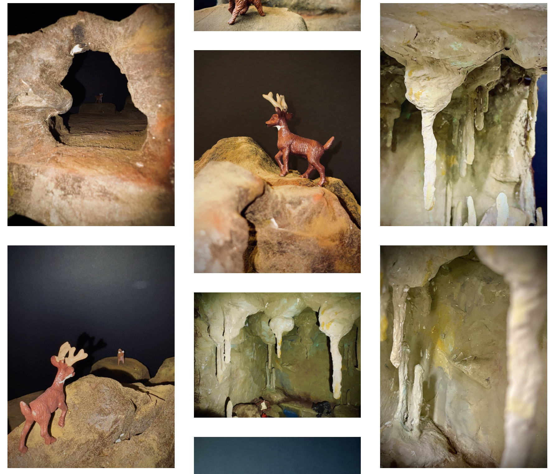 The project evolved through extensive research, material experimentation, and iterative making. Because literature on caves was limited, I studied both scientific documentation and artistic interpretations to better understand how humans have represented caves across cultures. This research informed my decision to create a cross-sectional model, allowing me to highlight the internal textures and spatial complexity of the environment.